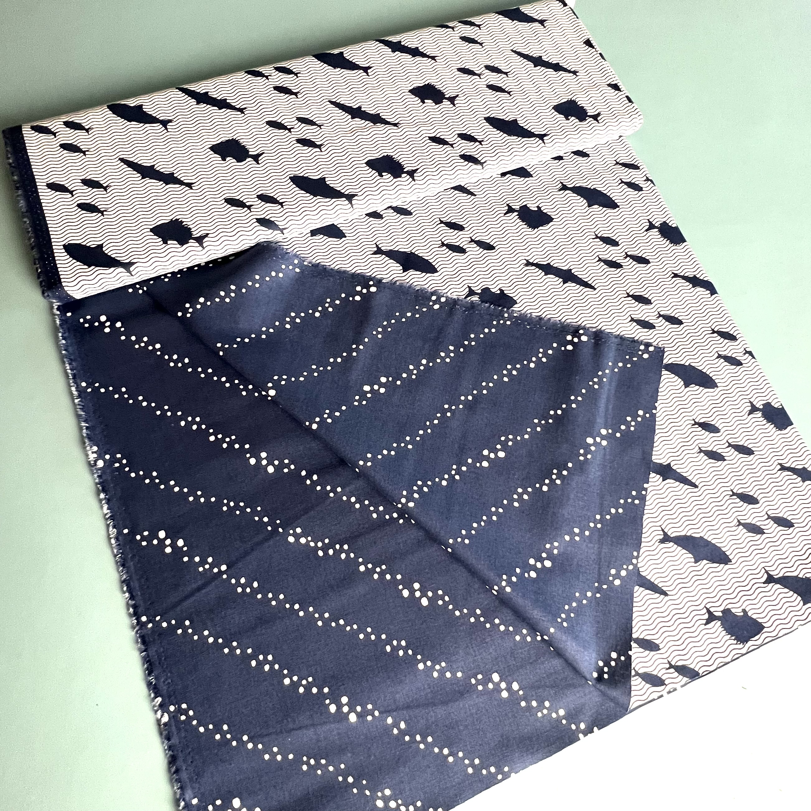 Bei diesem robustem Double Face Canvas Stoff in blau und weiß mit maritimen Muster handelt es sich um unelastische Webware aus100 % Baumwolle aus dem angesagten japanischen Stoffdesignstudio KOKKA aus der Serie TOY FABRICS by Yuri Himuro. Ein wunderbares, strapazierfähiges Stöffchen zum Nähen von Taschengut & Wohnaccessoires. Er wird als Double Face (dt.: "2 Gesichter") Stoff bezeichnet, da es keine klassische rechte und linke Seite gibt, sondern der Stoff gleich zwei unterschiedlich gestalteten Seiten hat, die beide optisch ansprechend und tragbar/zeigbar sind. Auf der einen Seite durchstreifen weiße Fische Wellen im Wasser und auf der anderen Seite sieht man weiße Luftblasen auf dunkelblauem Wasser. So lassen sich beide Seiten auch wunderbar in einem Nähprojekt vereinen.