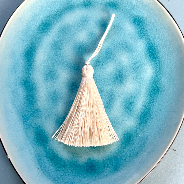 - Maße: Gesamtlänge 12 cm, davon 4,5 cm Aufhängeschlaufe und 7,5 cm Quaste