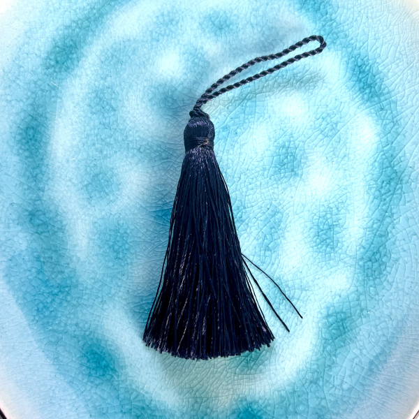 - Maße: Gesamtlänge 12 cm, davon 4,5 cm Aufhängeschlaufe und 7,5 cm Quaste
