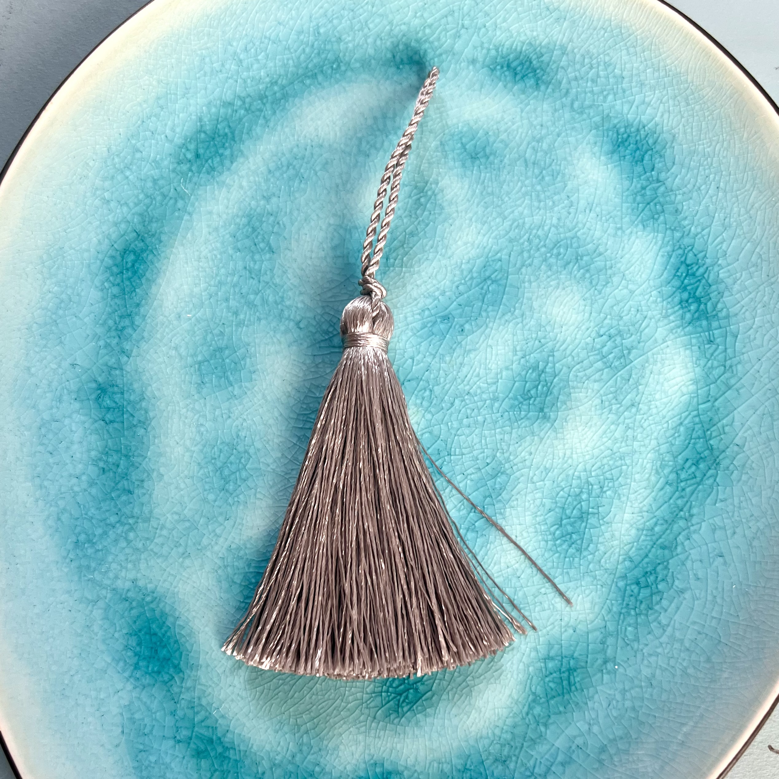- Maße: Gesamtlänge 12 cm, davon 4,5 cm Aufhängeschlaufe und 7,5 cm Quaste